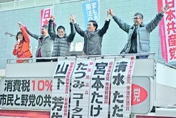 (写真)街頭宣伝で声援に応える(右から)宮本、山下、辰巳、清水の各氏=9日、大阪市 |